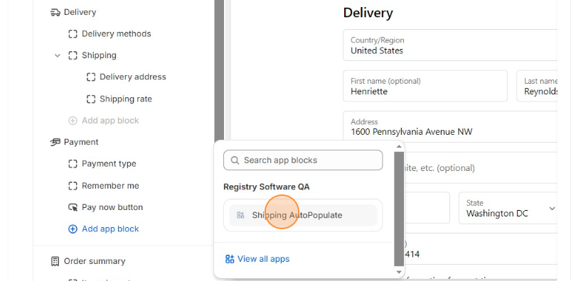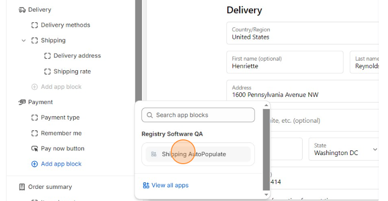 Automatically fills in the shipping address from the customer's MyRegistry.com account during Shopify checkout